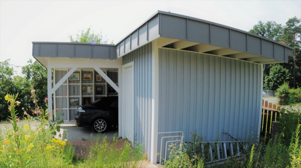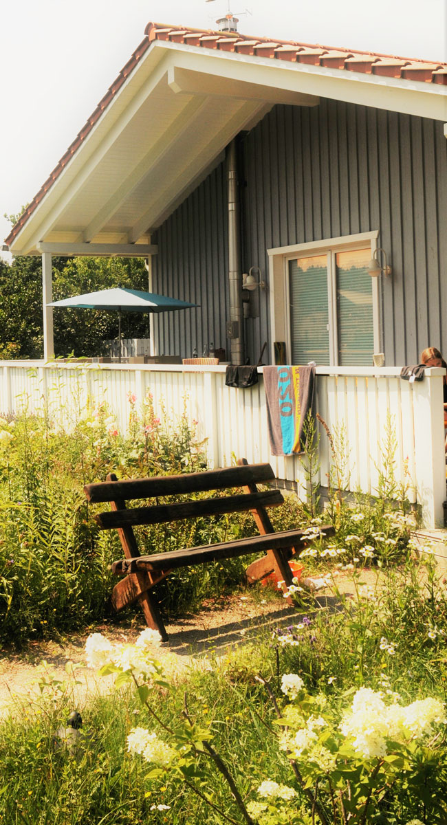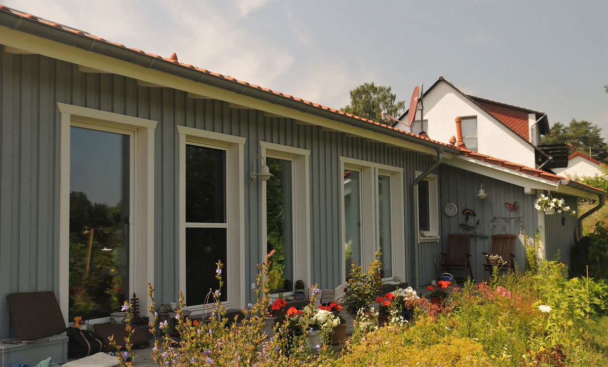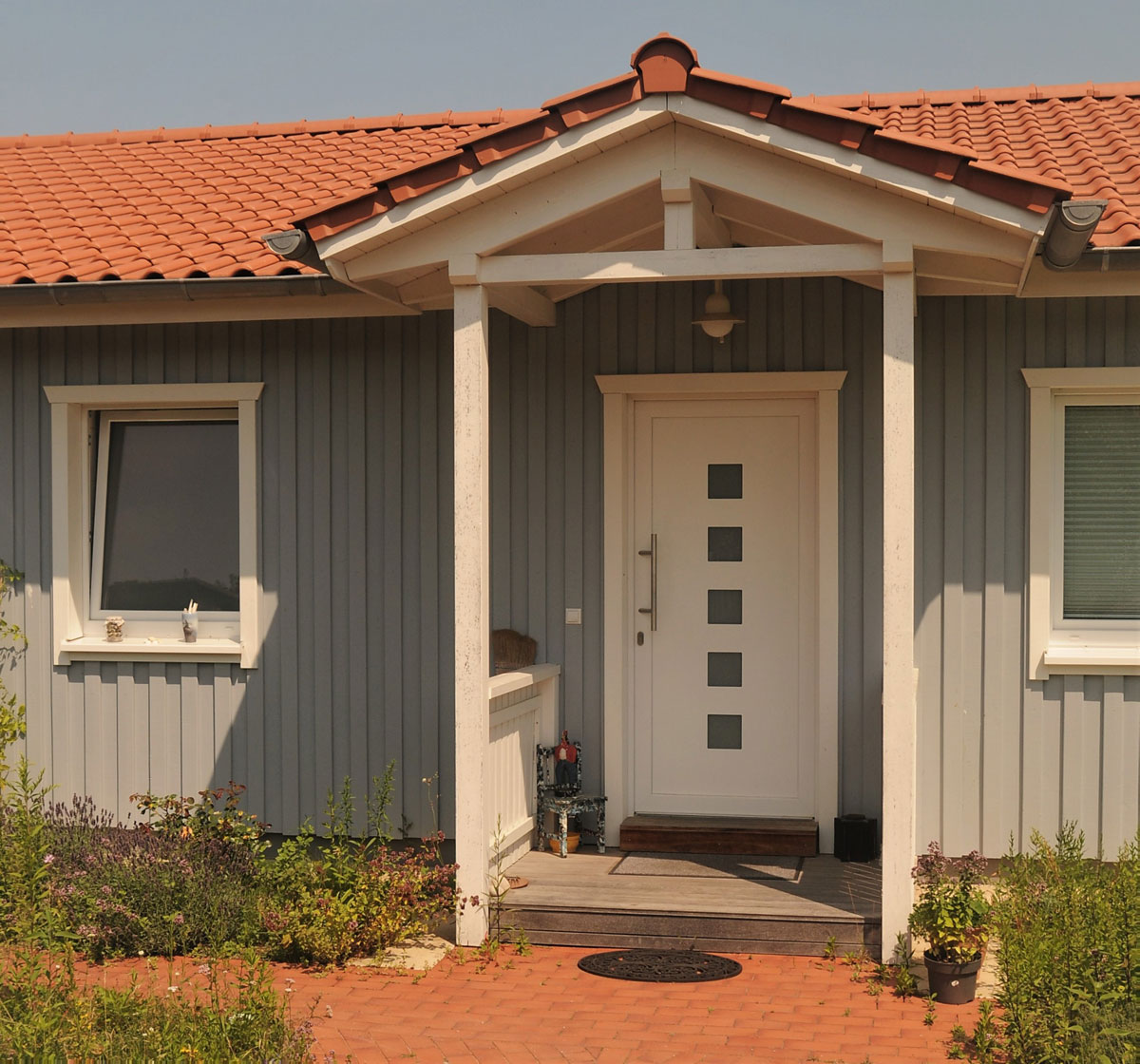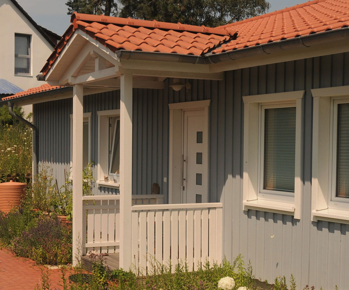 Einen hervorragenden Schutz gegen die im Winter und Sommer auftretenden Temperaturunterschiede bieten die mit Zelluloseflocken gedämmten Wände. Der Eingangsbereich und der überdachte Teil der umlaufenden Terrasse bekamen ein Geländer aus Holz. Ein Carport mit abschließbarem Abstellraum im gleichen Fassadenlook wie das Haupthaus bietet Platz für Auto, Fahrräder und Gartengeräte. So verbreitet das Schwedenhaus-Ensemble zu jeder Jahreszeit Urlaubsstimmung.